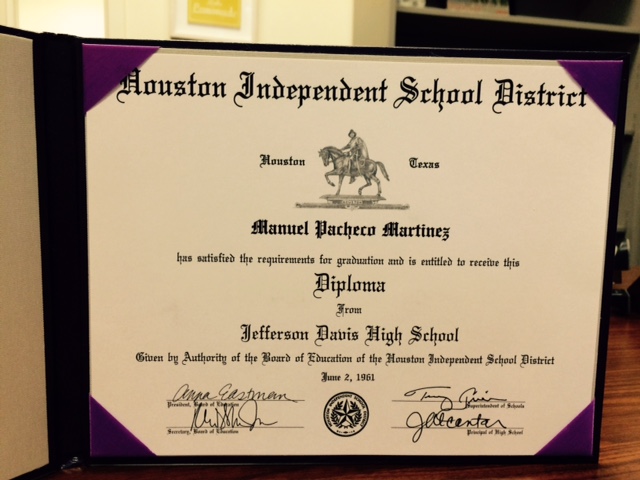 Transcript in hand, I headed over to dad’s alma mater, Jefferson Davis High School. As I walked the halls of Jeff Davis, I tried to imagine what it was like for dad in 1957; a shy, tall, skinny, fifteen year old Mexican American teenager in a predominately white school. He spent the entirety of his elementary and middle school years at what he called “The Mexican School” which was known as Dow Elementary in HISD.